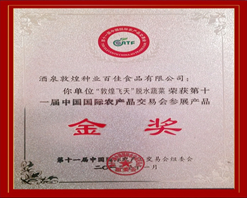 酒泉敦煌種業(yè)百佳食品公司“敦煌飛天”脫水蔬菜榮獲第十一屆中國(guó)國(guó)際農(nóng)產(chǎn)品交易會(huì)金獎(jiǎng)